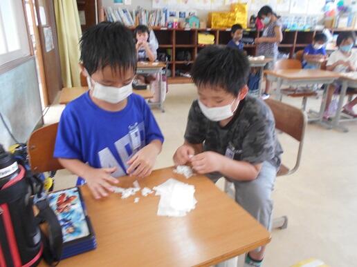 1・2年生が、1学期の学校生活や学習を振り返って、記録していました。