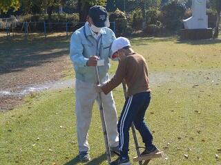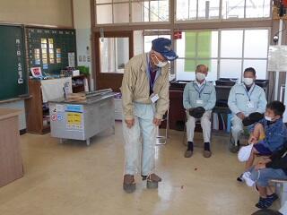地域の方に昔の遊びを教えてもらおう 投稿日時 : 2021/11/16 学校管理者 谷川さんご夫妻、永友さんご夫妻、大濵さんに、昔の遊びを教えていただきました。 竹馬、竹ぽっくり、竹とんぼ、水鉄砲、木ごま。すべて谷川さんの手作りでした。手作りと聞いて、子どもたちから「えっ!すごい!」と歓声があがりました。 すべての遊びを、優しく根気強く教えていただき、初めて体験する遊びも、何度も挑戦して上手になりました。 いつもあいさ2の日に校門で迎えてくださったり、一緒に歩いて登校してくださったりする地域の方と、交流できたことも、大変嬉しかったようです。