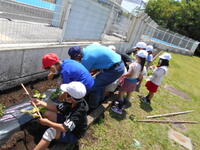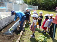 5月27日(金)、1・2年生がプール横の花壇にサツマイモの苗を植えました。用務員の先生に、芋を植えられるようにマルチを張って準備してもらったところに、1本ずつうめていきました。マルチに穴を開け、その中に入れ、さらに棒を使って押し込んでいきます。教えていただいた方法で、みんなで協力して植えました。これから、成長して秋にはたくさんお芋が収穫できるとうれしいです。