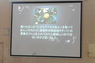 今回は、総合的な学習の時間の取組として、高原町の魅力を多くの人に知ってもらうために、各学校の6年生が考案した「オリジナル丼」と「スイーツ」についての発表を行いました。発表には、審査員として企業の方にも参加していただき、審査結果に基づいて、試作作りと実用化までの検討をされるということでした。各グループともとても張り切っていました。