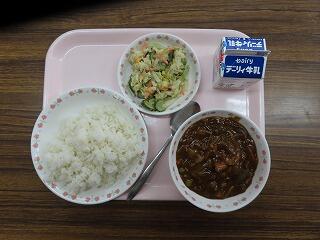 麦ごはん、ハヤシライス、ごまドレサラダ