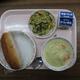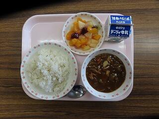 今日は、子どもたちからも大人気の「ハヤシライス」です。豚肉やニンジン、玉ねぎ、エリンギが入っています。特に「エリンギ」のコリコリした食感がハヤシライスの味をより引き立ててくれます。甘いフルーツとジュレのプルプルした食感の相性がよく、こちらもとても美味しいです。