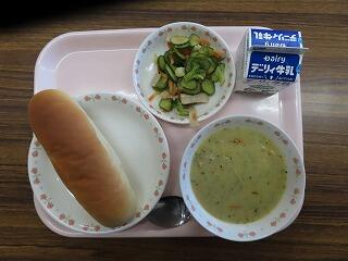 今日から給食開始です。スープはコーンがたっぷりでパセリの風味もよく、とても美味しいです。サラダはキュウリやニンジン、ブロッコリー、ニンジン、ハムが入っていて、こちらもとても美味しいです。