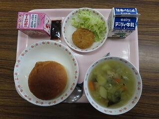 今日は、子どもたちに大人気のチキンカツを挟んだバーガーパンです。ポトフは、ジャガイモや鶏肉、玉ねぎ、ホウレンソウなどが入っていて、心も体も温まるメニューです。デザートのケーキはいちごかチョコを事前に選んでいます。クリスマスにぴったりでとても美味しいです。