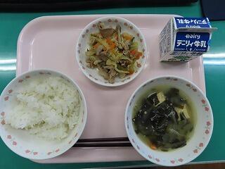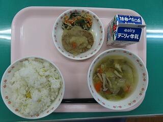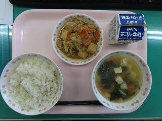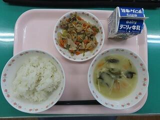 今日の豆腐のみそ汁は、ジャガイモやエノキ、小松菜も入って具沢山。美味しくいただきました。具沢山のみそ汁には、たんぱく質・ビタミン・ミネラル・食物繊維が豊富に含まれています。豚肉のしょうが焼きと共に今日の給食で元気の源をいただきました。