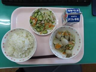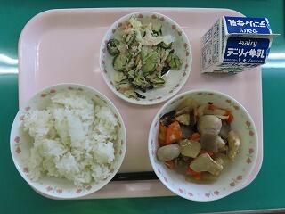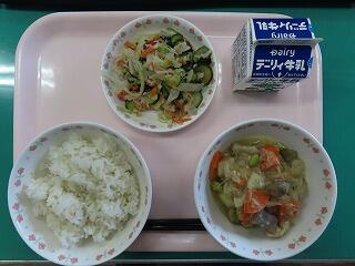 今日の給食は野菜のたっぷり入った「いり鶏」です。見た目もとても美味しそうで、もう「いただきます」が待てません! 酢の物のキュウリもシャッキシャキで美味しかったです。