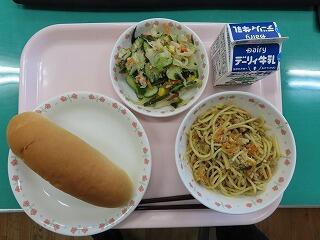 「ナポリタンスパゲティ」 待ってました、ナポリタンスパゲティ! 子どもたちの好きな給食ランキングでも上位に入るメニューです。今日の野尻小の子どもたちも笑顔で給食を食べていました。野菜サラダもツナやコーンなどたくさんの食材が入っており、冷えていておいしかったです。