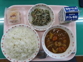 今日はカレー風味の肉じゃがでご飯も進むメニューです。かみかみサラダは子どもたちにも大人気。ごぼうのシャキシャキ感がたまりません。