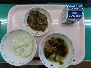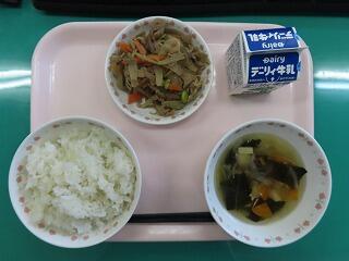 「焼き肉」には、豚肉と共にピーマン、エリンギ、キャベツも入っていて食べ応えがあり、今日もご飯がすすむメニューでした。そして、焼き肉と言えばわかめスープ。ミネラルが豊富に含まれた「わかめ」でまた野尻っ子たちは健康で元気に成長することができそうです。