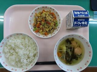 チャーハン 給食でチャーハンが食べられるなんて幸せです。チャーハンは焼豚、卵、あおまめ、ニンジンも入っていて美味しくいただきました。野尻学校給食センターでは野尻町内の給食のために、今日は500食以上のチャーハンを作っていただきました。すごいですね。