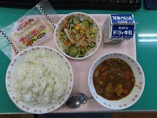 今日は「野尻小のリクエスト献立」。ビーフカレーに使われている牛肉は宮崎県産です。子どもたちの大好きなカレーに加えて、デザートのチョコクレープまで付いていました。今日も給食で元気をもらった野尻っ子たちでした。