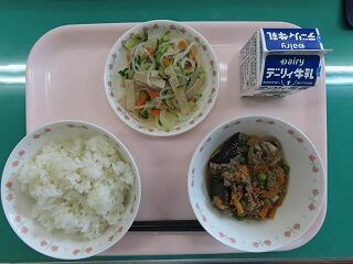 麦ご飯 ナスの中華炒め バンサンスー 牛乳