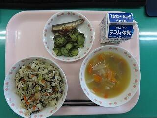 西諸っ子ご飯・・・「に・し・もろっ・こ」 ニンジン・シイタケ・トウモロコシ・ゴボウのそれぞれの食材名から文字をとって付けられたメニュー(まぜご飯)です。その名のとおりニンジン、シイタケ、トウモロコシ、ゴボウがたっぷり入っていて間違いない味(地産地消)です。今日は他にも「すまし汁、つくね、キュウリの昆布和え」もありました。優しさがつまった献立です。