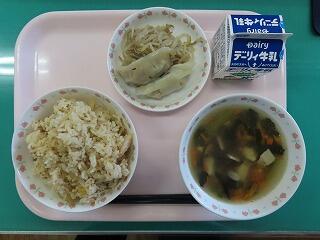 プチ餃子スープ。「プチ」ということでスープの中にはかわいらしい小さめの餃子が入っていました。子どもたちは喜んで食べていたようです。また、今日は「地産地消こんだて」の日。中華炒めの中に入っているピーマンは野尻町紙屋地区の生産者の方から提供いただいたものです。新鮮なピーマンだけあって歯ごたえもよく、美味しくいただくことができました。