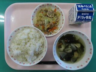 麦ごはん 中華スープ 鰹のケチャップあえ 牛乳