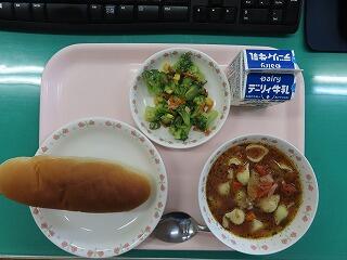 問題「ミネストローネはどこの国の料理でしょう?」 答えは「イタリア」 今日の給食時間の放送で出されたクイズです。ミネストローネにはショートパスタの一種、貝の形をした「コンキリエ」も入っていて、楽しみながらいただくことができました。いつも美味しい給食、ごちそうさまです。