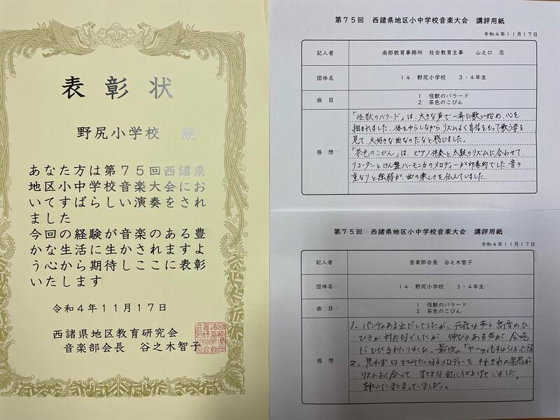 11月18日(金)、昨日3・4年生が参加した西諸県地区小中学校音楽大会の会長と来賓としておこしになられた南部教育事務所の先生からの講評が届きました。あわせて賞状が届きましたので掲載いたしました。