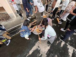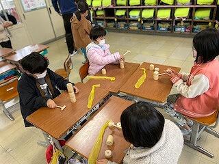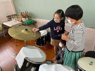 2年生は音楽科の授業で、グループごとに「朝のリズム」という曲に合わせて打楽器をうつ練習をしていました。意見を出し合いながら工夫して学習を進めていましたよ。