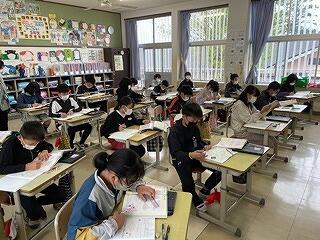 3年生は、教室掲示用の自分の似顔絵を一生懸命描いていました。