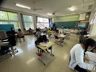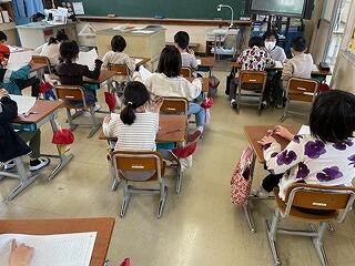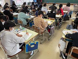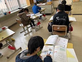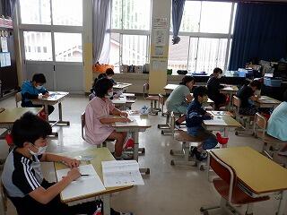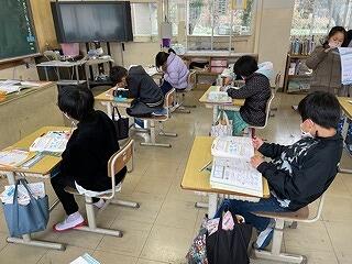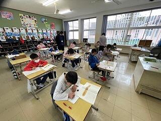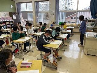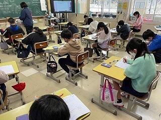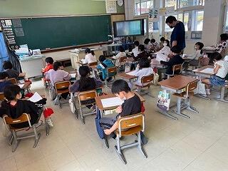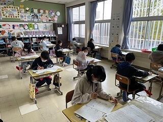 5年生は、CRTテストのアシストシートをつかって国語科の説明文の問題に取り組んでいました。長文を読んで選択問題や記述問題に挑んでいましたが、正しい答えを導き出すためのこつやヒントを学級担任が丁寧に説明しながら、学習を進めていました。