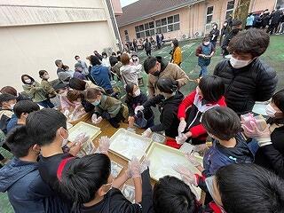 12月3日(土)、収穫祭(もちつき大会)がありました。朝早くから営農組合やPTA役員の皆様にお集まりいただき、道具の準備や、机・用具の配置、そして、火起こし、、など、当日もたくさんのことをしていただきました。開会式が終わると、餅つき体験を始まりました。大人の方にある程度ついてもらった後に、交代交代で2人ずつもちをつきました。簡単そうに見えても、餅の真ん中につくのはなかなか難しく、臼のかどに、杵をぶつけてしまう子どもが何人もいましたが、何度かするうちに上手にうつことができるようになりました。みんなの力で見事におもちがつき上がり、もちを丸める作業をするときは、みんなとてもいい笑顔でした。餅つき体験後の閉会式では、営農組合の方々に対して代表児童が感謝の言葉を述べたり、お礼の手紙を模造紙にはったものを差し上げたりしました。野尻小の子ども達は、1・2年生で芋植え・芋掘りを、3年生でお米作りを体験し、作物を生産する喜び、周りの方々への感謝、食への関心、、、などいろいろな心が育っています。コロナ禍であっても、感染対策を十分取りつつ、今年度、実施できたことで、「植える、育てる、収穫する、そして、いただく」ことをすべて体験することができました。収穫祭に向けて、営農組合の皆様、PTA役員の皆様、保護者の皆様にたくさんのご協力をいただきました。本当にありがとうございました。今日は、子どもたちがもち帰ったおもちを、家族みんなで召し上がったください。