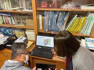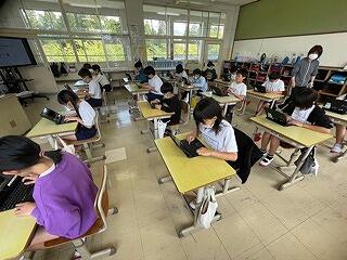 6年生の社会科の授業の様子です。平和について調べたことをタブレットを使ってシートにまとめていました。友達と力を合わせていました。