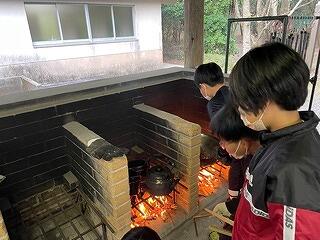 かまどで飯盒で御飯を炊いたり、カレーを作ったりする様子