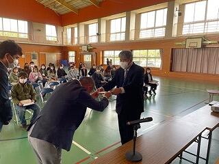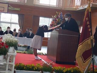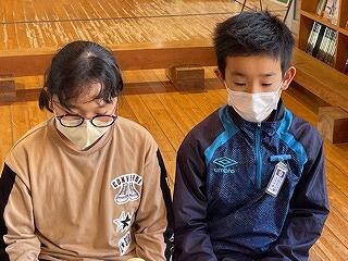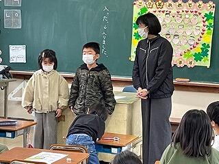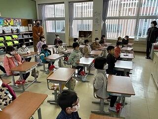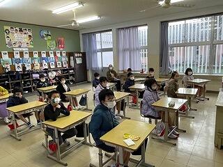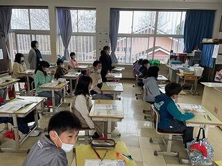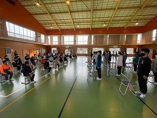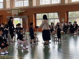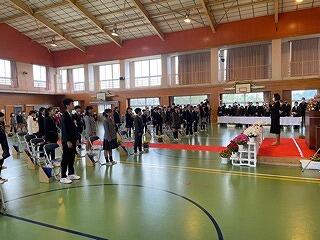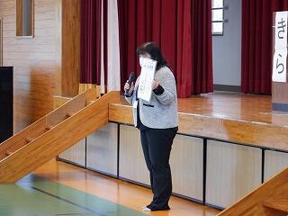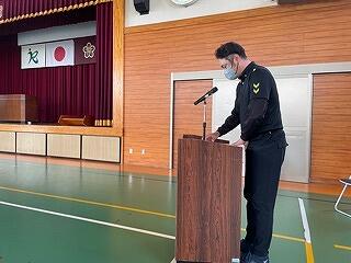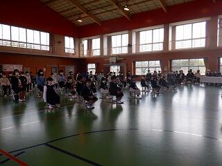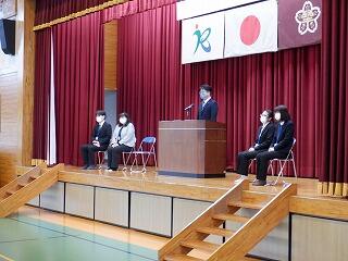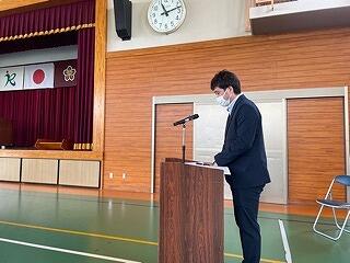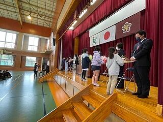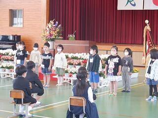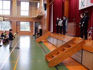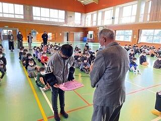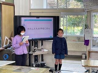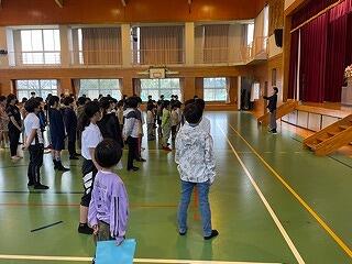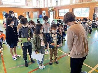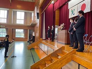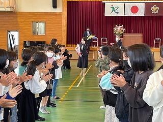 3月24日(金)に令和4年度修了式がありました。学級担任の合図で各学年がその場に立ち、代表者が前に出て修了証を受け取りました。1年から5年生まで95名全員無事に進級することになります。作文発表では、小学1年生児童が今年度の反省を踏まえ、次年度頑張りたいことを力強く発表しました。校長としては各学年の流石(さすが)を紹介し、今年1年がんばったことは来年さらによくなるように、また、うまくいかなかったことは春休みにしっかり準備をして、新年度、気持ちのよいスタートがきれるように!と話しました。そして、本年度最後の校歌を全員で元気よく歌って式を終えました。