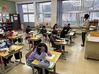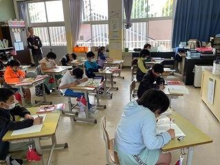 4年生は問題集の中から国語科の説明文の問題をみんなでとき、答え合わせとどうしてその答えになるのかを学級担任が解説していました。自分の出した答えが〇か、×かだけでなく、正しい答えの根拠を確認し合うことで、スキルが高まる実践です。