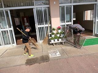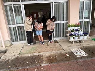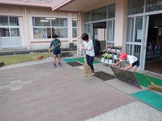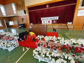 校舎内外の清掃や花の設置、体育館の会場設営などの仕事をみんなで分担して行いました。おかげで、とってもきれいな会場に整いました。
