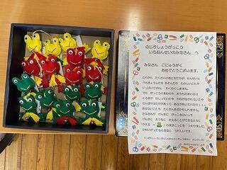 4月7日(金)、小林地域婦人連絡協議会野尻支部の皆さんより、かえるの人形のお守りが届きました。この人形は手作りでつくられたものであり、入学する子どもたちが安全に過ごせるように!との思いが込められています。婦人連絡協議会の皆様は、毎年、入学式にあわせて、この人形のプレゼントをしてくださったいます。本当にありがたいです。