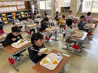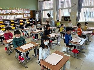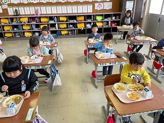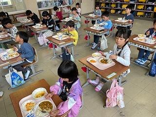今日は1年生にとって初めての給食でした。みんなドキドキワクワクしながら給食時間がくるのを待っていました。配膳が終わると「いただきます。」をして、食べ始めました。メニューは人気のカレーライス!とてもうれしそうに味わいながら食べていました。まだ、グループをつくっての給食はできませんが、「おいしい、おいしい」といってもりもり食べていました!給食を残さず食べて、ぐんぐん大きくなってほしいです!