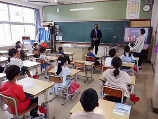 3年生はALTのダレン先生との外国語活動の学習をしていました。ダレン先生との最初の学習でしたので、質問攻めでした。出身は?身長は?お嫁さんは?等々。