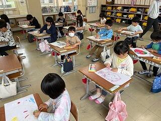 1年生はお絵かきをしていました。みんなクレヨンで思い思いに描いていました。
