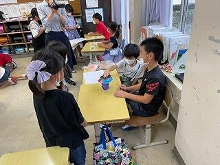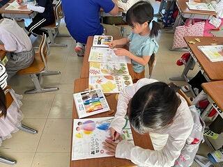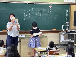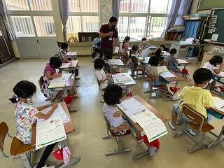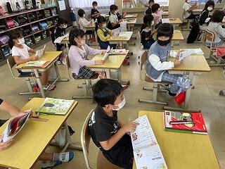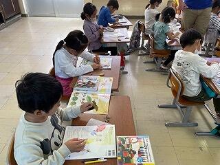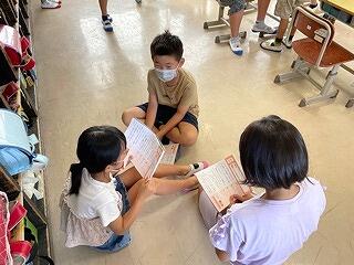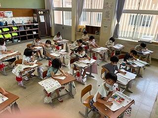 1年生は夏に遊んだことを絵と文に表していました。とっても集中していました。2年生はお気に入りの本についてしらべたことを、メモをもとに発表していました。