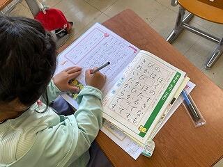 1年生は書き方の勉強をしていました。教科書のお手本をよく見て、とても集中して書いていました。文字もきれいでした。