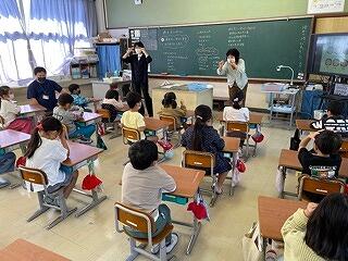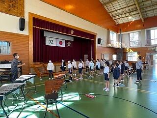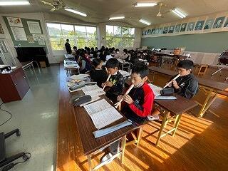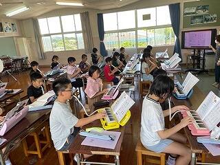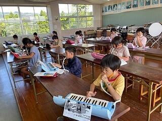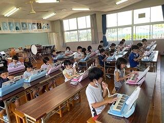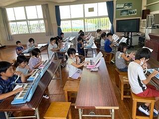 5年生は、音楽の学習で、鍵盤ハーモニカによる和音の演奏にあわせて、リコーダーで茶色の小びんを演奏していました。いいメロディー奏でていました。