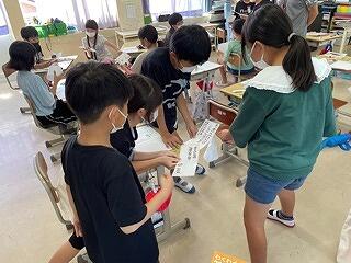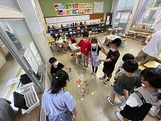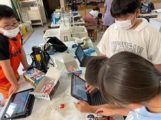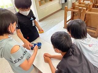 4年生は理科の学習で回路図をもとに、どのようにつなげば自動車が速く進むかいろいろ試していました。班で協力して学習していました。
