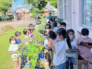 1年生はアサガオのようすを観察し、タブレットのカメラ機能を使って撮影していました。「花が〇つさいたあ!」と喜んでいました。