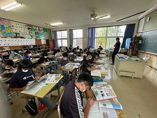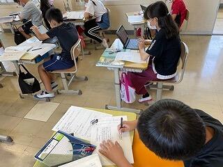 5年生は国語科の学習で「引用する言葉」をつかいながら報告文をつくっていました。机の上にタブレットや図書資料などを広げ、学習していました。