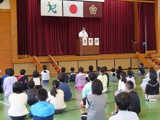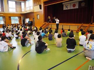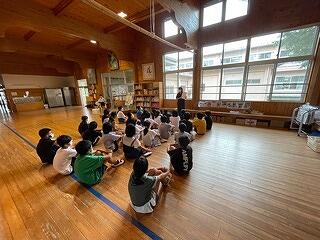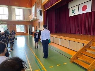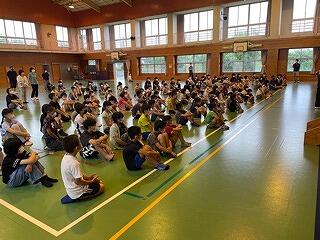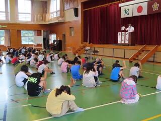 7月4日(月)、7月の全校集会がありました。校長からは「いのちの教育週間(7/1~7)」についての話がありました。「1つしかない命を自分で大切にしよう!」と、台風接近に合わせて事例を交えながら話しました。その後、生徒指導の先生からは今月の生活目標「夏を元気で安全にすごそう」について話がありました。登下校や廊下歩行について注意を呼びかけられました。「は・さ・み」の合い言葉「はしらない・さわがない・みぎがわをあるく」の確認がありました。最後に、作品展で入賞した3名の子どもに賞状がわたされました。表彰後、校長は「野尻小は作品展での表彰だけでなく、スポーツ少年団も優秀な成績をのこしている。これはすばらしいし、ほこらしいことである。でも、何より大切にしてほしいことは1時間1時間の授業である。学校での勉強をしっかりがんばってほしい。その積み重ねが大きな成果につながる」と話しました。