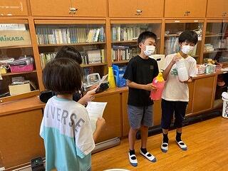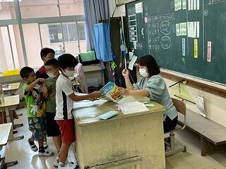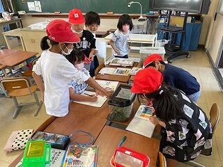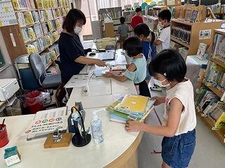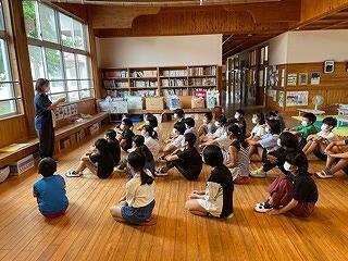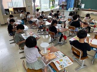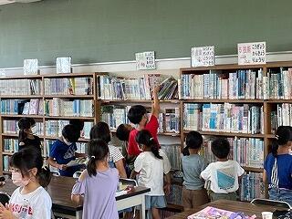 2年生は夏休みに借りる本を選んでいました。1人5冊まで借りられるんだそうです。みんな夢中で本をさがしていました。家までまちきれずに、少しの時間でもさっそく借りた本を読んでいました。