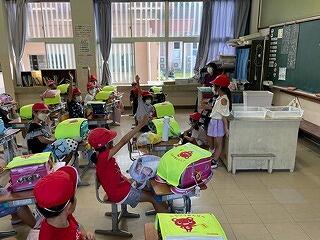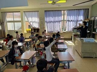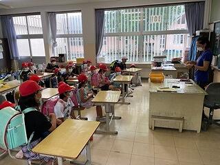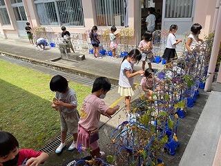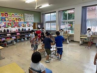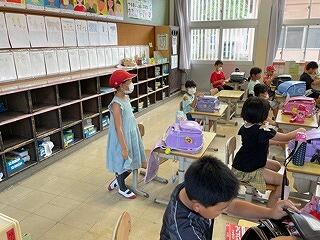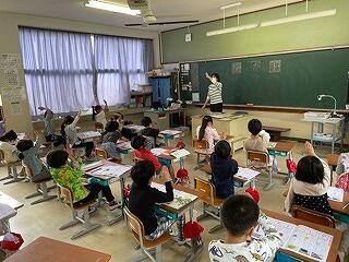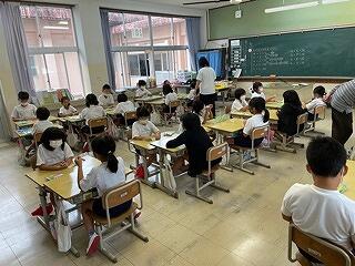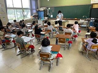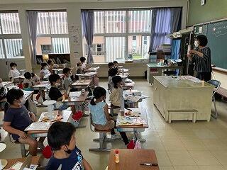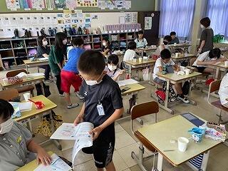 2年生は生活科でむしとりをしました。バッタやモンシロチョウなどをつかまえていました。中には、トンボを捕まえた子どももいました。1校時でもあつかったので探索の時間は短めにし、途中休憩(給水タイム)もとりながらの学習だったようです。