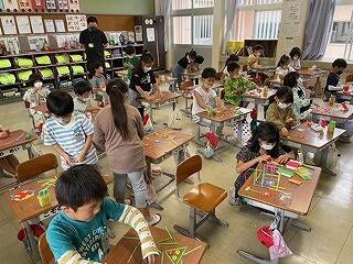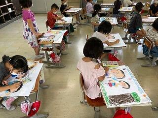 「1年生はかきたいものをおおきくかこう」というめあてで、クレヨンで絵をかいていました。楽しかったことを頭で思い出しながら、夢中になってかいていました。