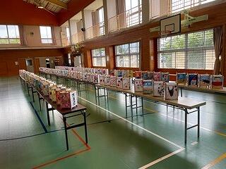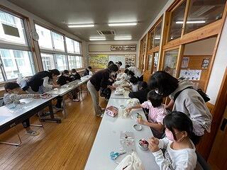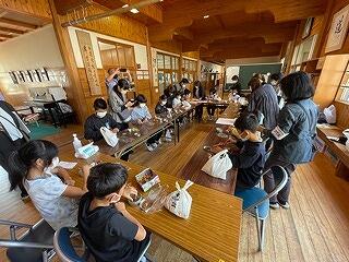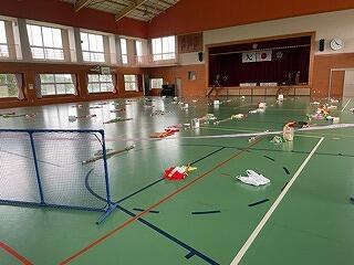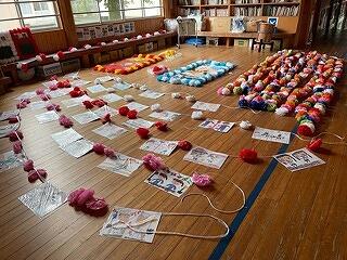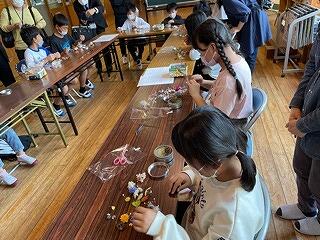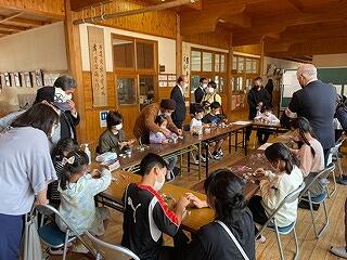 式典の後は記念イベントがありました。児童は縦割り班をつくって5つのブース「Aブリザードフラワーの制作やB全児童での手桜の共同制作、C竹細工(ゴムでっぽうの制作)、Dゴムでっぽうのゲーム(射的)、E野尻小〇×クイズ」のすべてをラリー形式で回り、それぞれの活動に取り組みました。賞品や景品があり、子ども達が準備したビニール袋にはお菓子などがいっぱいたまっていきました。どのブースも子ども達にとって興味深く楽しいものばかりで、笑顔いっぱいすてきな活動になりました。