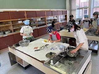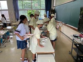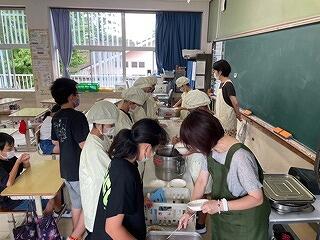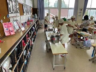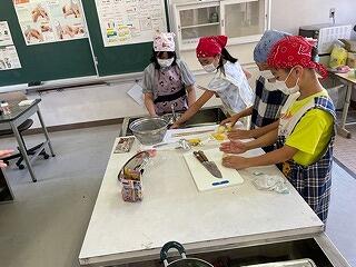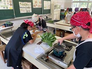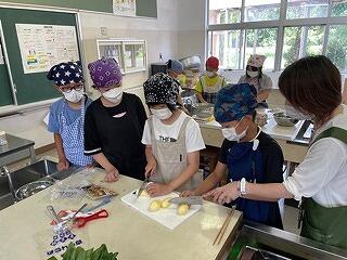 7月11日(月)、5年生は家庭科の調理実習がありました。「ゆでいも」と「青菜のおひたし」をつくっていました。ゆでいもはじゃがいもの皮をピーラーできれいにむき、ねこの手をつくって切り、芽もえぐり取ることができました。ほうれんそうをゆがくときは根元からにし、ゆがいた後は水で冷やすことなど、しっかりできていました。みんなで協力して楽しく活動できていました。
