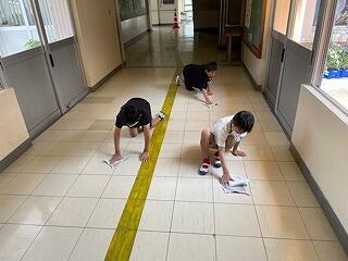 「君たち!何年生?」「4年生です!」「何をしているの?」「水泳の後、廊下を通って教室に帰ったので、廊下が水でぬれたから拭いてるんです!」「すごいね。えらいね」「いつも、水泳の後は廊下を拭いています」3人の4年生はきれいに乾いたぞうきんで廊下をふき上げると、何事もなかったように教室に帰っていきました。