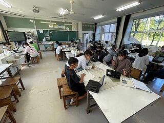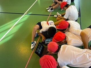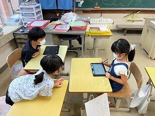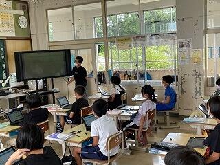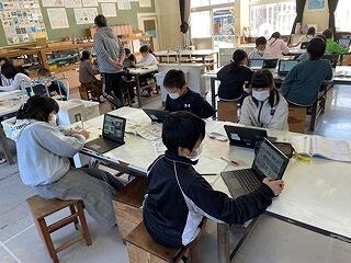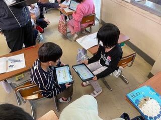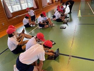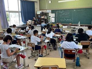 5年生は理科の学習で、タブレットの検索機能を使い、川の上流と下流でどのような違いがあるかを調べていました。みんな黙々と調べ学習に取り組んでいました。