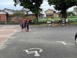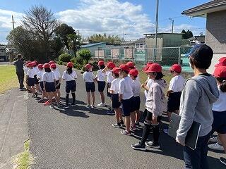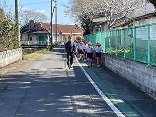 これは散歩しているのではありません。持久走大会のコースの下見です。体育の時間に中学年部の学級担任が大会コースを説明しつつ危険箇所を注意しながらみんなで歩いていました。持久走大会ではグラウンドだけでなく、学校の周りの道路も走ります。