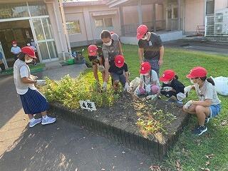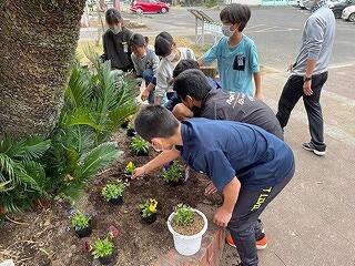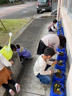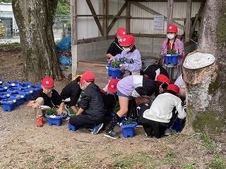 野尻小学校では一人一鉢運動をしています。今朝は、6年生が学校園に花の苗を植え、4年生が自分用のポットに花の苗を移植していました。1年生は、自分の植えた苗に水をやっていました。1人1鉢運動を通して、自然を大切にするやさしい心が育っています。